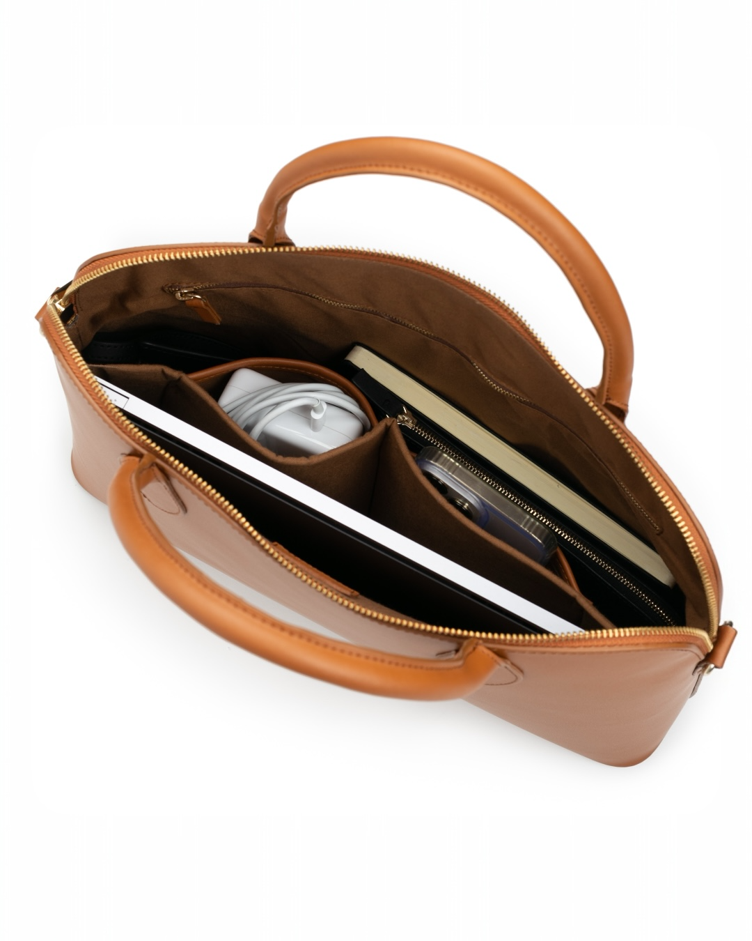 Vesken har matt italiensk storfeskinn med en diskret struktur som føles varmt og eksklusivt. Innsiden er ton-i-ton canvas med ett hovedrom, polstret laptop-lomme, en større glidelåslomme og to mindre lommer til mobil og annet.